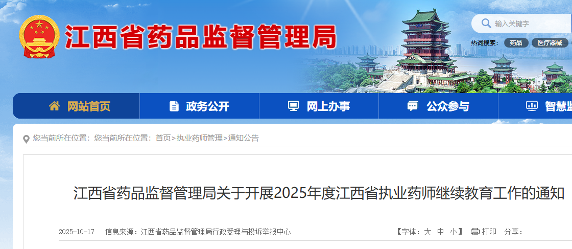 根据江西省药品监督管理局2025年10月17日发布的通知,2025年度江西省执业药师继续教育工作已全面启动。本次教育严格遵循《执业药师继续教育暂行规定》及江西省人社厅《关于开展2025年度专业技术人员继续教育学习的通知》要求,现将具体安排及操作指引整理如下: